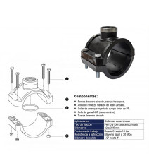 Fabricado en polipropileno (PP) con anillo metálico reforzado (acero zincado), sello O-ring NBR para hermeticidad y rosca NPT hembra de 3/4", incluye pernos hexagonales para fijación segura. Apto para perforación en seco o bajo presión con herramientas especializadas.