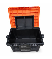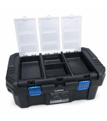 La Caja mediana de 19" Plástica marca FERRAWYY es un contenedor de gran utilidad para guardar, organizar y transportar las herramientas. Esta caja plástica de 19" en la parte superior cuenta con dos compartimentos de tapa transparente de varias divisiones para guardar pequeñas piezas como puntillas, tornillos o repuestos. Por otra parte, dentro de la caja encontrará una bandeja movible en donde podrás poner los instrumentos de trabajo mas pequeños.